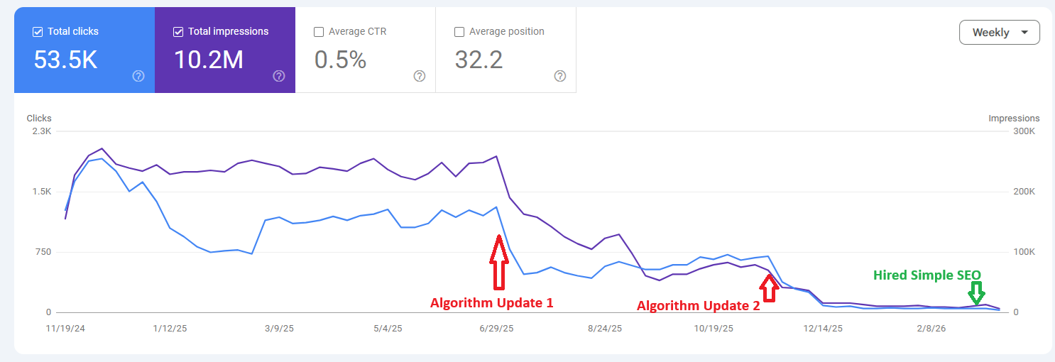 This shift did not immediately result in a collapse, which is often what makes these decisions so deceptive. For a period of time, performance appeared relatively stable. However, with two subsequent Google algorithm updates, the impact became undeniable.
